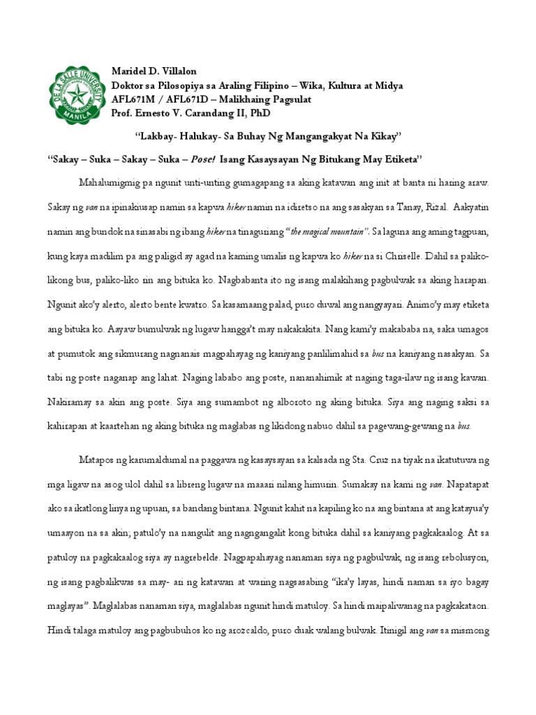 Lakbay Sanaysay travel essay o travelogue Ito ay isang uri ng lathalaing ang pangunahing layunin ay maitala ang mg naging karanasan sa paglalakbay Nonon Carandang Ito ay tinatawag niyang sanaylakbay kung saan ang terminolohiyong ito ayon sa kanya ay binubuo ng tatlong konsepto. Minsan naman kailangan mo talagang gumawa ng sanaysay dahil requirement ito. 14102018 Ang mga lakbay sanaysay ay mga uri ng sulatin kung saan ang may akda ay nagbibigay ng paglalarawan ng kaniyang mga naranasan gabay o damdamin sa paglalakbay.