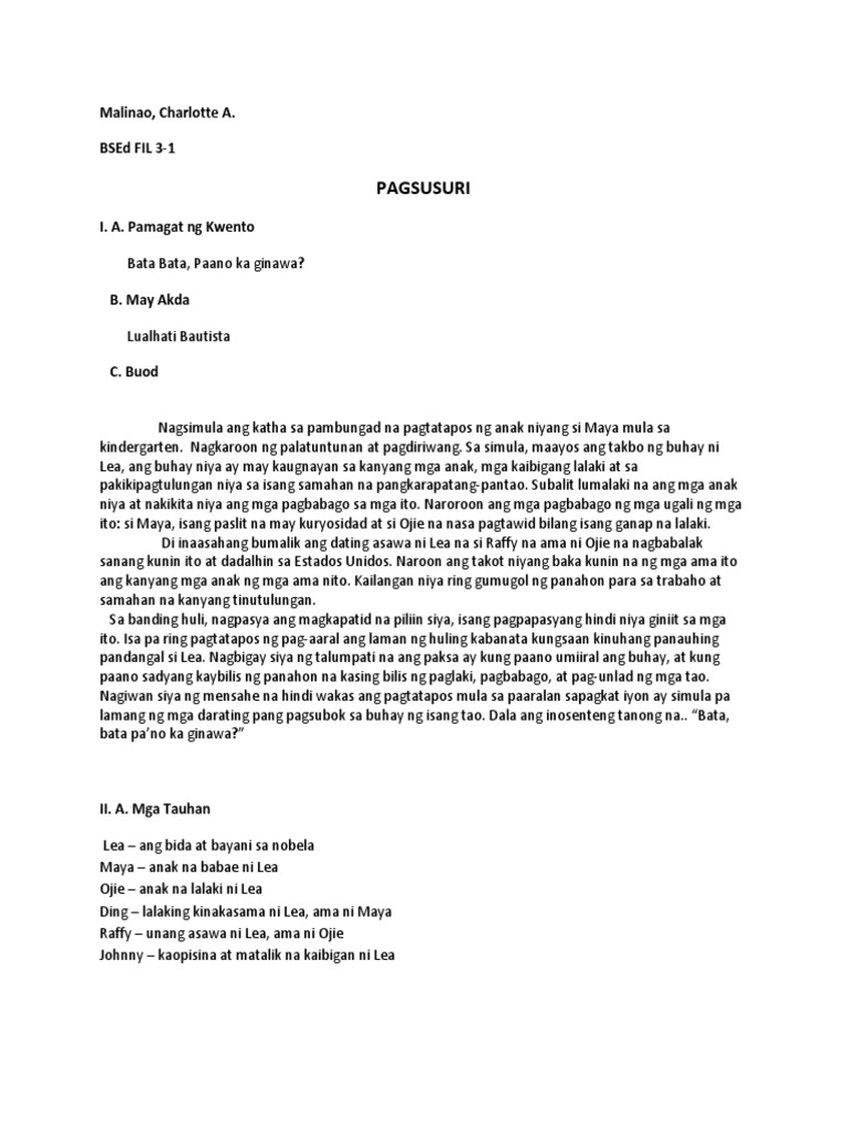 As the mother of two children born of different fathers Lea has lived her life outside the constraints of social convention but when her former lovers reemerge to stake their claim on their kin. BSEd FIL 3-1 PAGSUSURI I. Apr 15 2020 Hanggang sa ang bata ay hindi na bata kundi ama o ina.