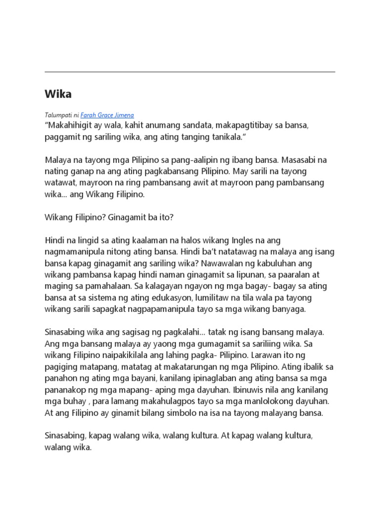 Jun 21 2010 para saken na isang magaaral mapapaunlad natin ang wikang filipino sa pamamagitan ng paggamit nito upang manatili ang kahalagahan ng ating wikang pambansa wag natin hayaan na mapalitan ng ibang wikang banyaga ang ating pambansang wika at mahalin natin ang sariling wika at ipagmalaki natin ito ipakita natin kung gaano natin ito pinapahalgahan para sa gayun sa mga ibang dayuhan na pumpunta sa. Drawing iskultura sand animation o anumang uri ng sining. It has been read 299 times and generated 0 comments.