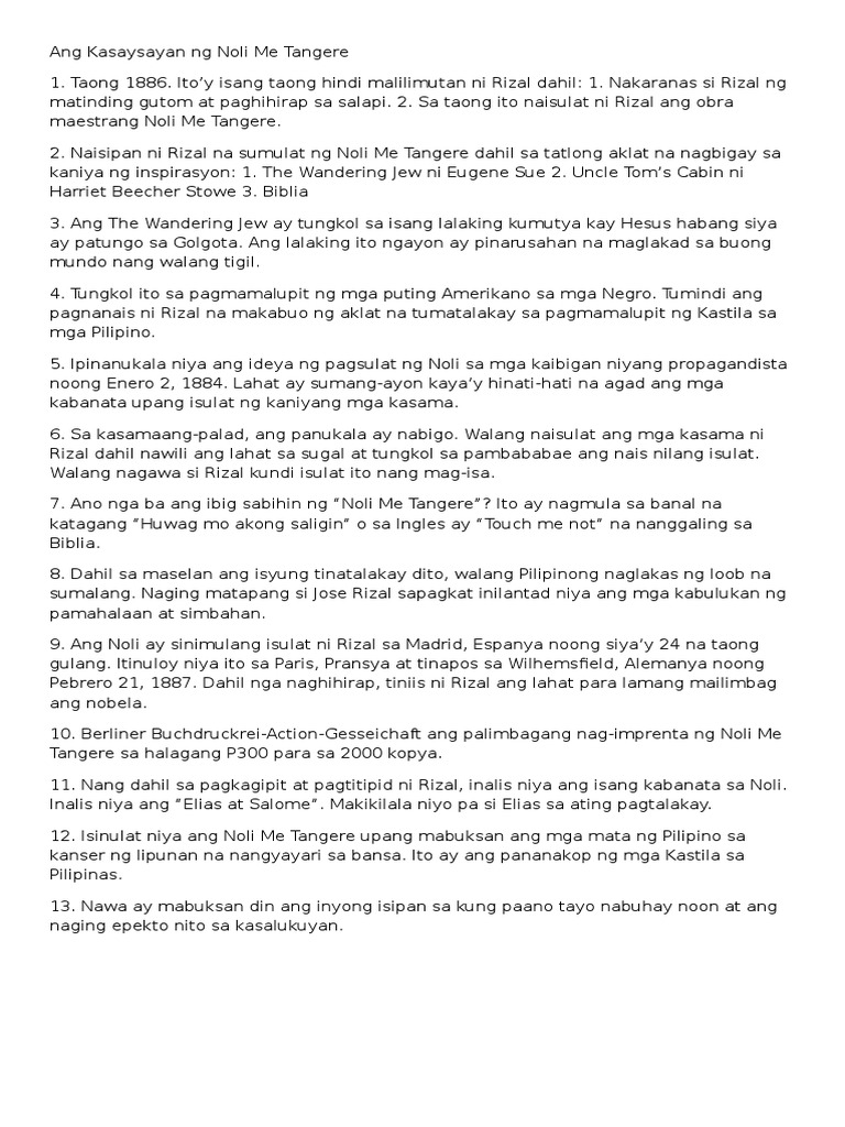 Paano nagsimula ang nobelang noli me tangere. Isang Pagtitipon Magtatapos na ng Oktubre nang nagpahapunan si Don Santiago de los Santos o kilala bilang si Kapitan Tiago. 13-17 sa Bibliya na tumutukoy kung paano pinagsusuot ng mga patalastas ang mga may ketong upang. Naisipan ni Rizal na sumulat ng Noli Me Tangere dahil sa tatlong aklat na nagbigay sa kaniya ng inspirasyon.